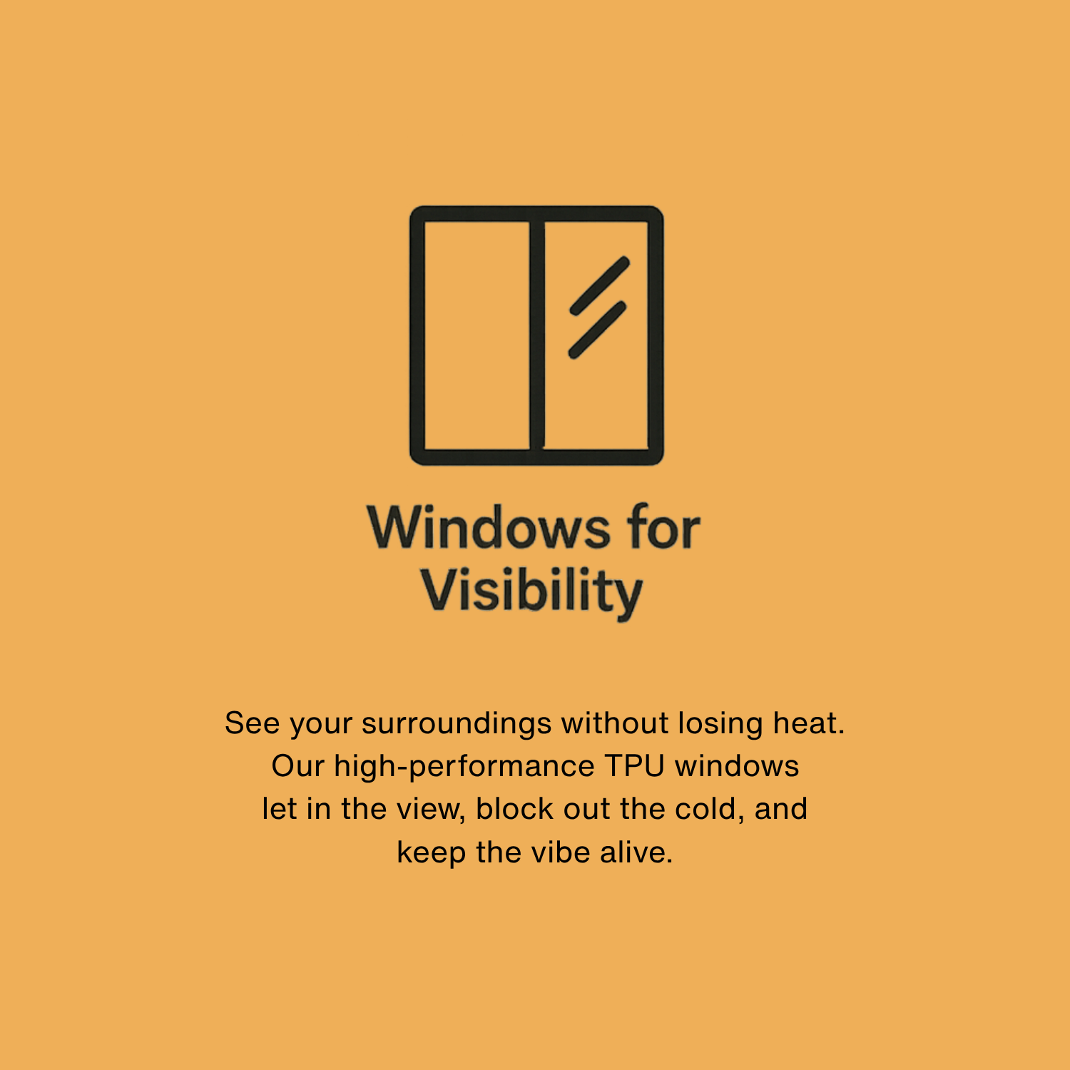 Our tent is designed to handle real adventure, from your backyard to wherever you take it. Made with rugged 300D Oxford fabric and layered for insulation, it keeps the heat in and the weather out. With quality zips, clear TPU windows, and smart ventilation, it’s built for comfort, safety, and visibility. Lightweight, durable, and ready for anything, it’s the kind of setup you’ll want to take everywhere.